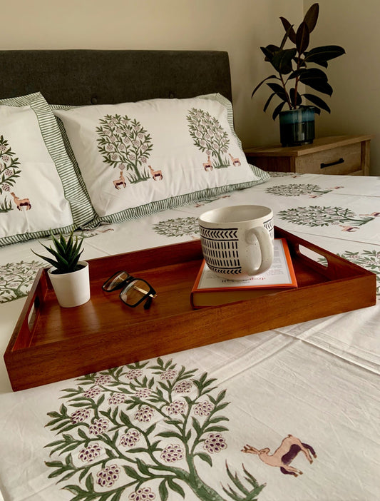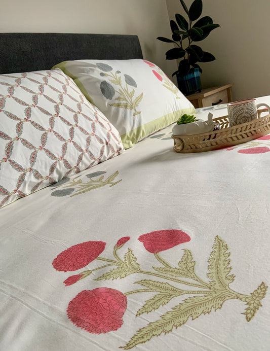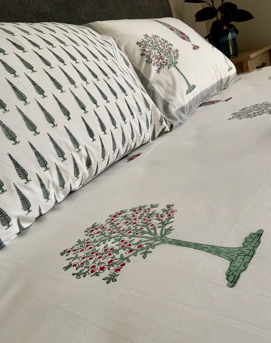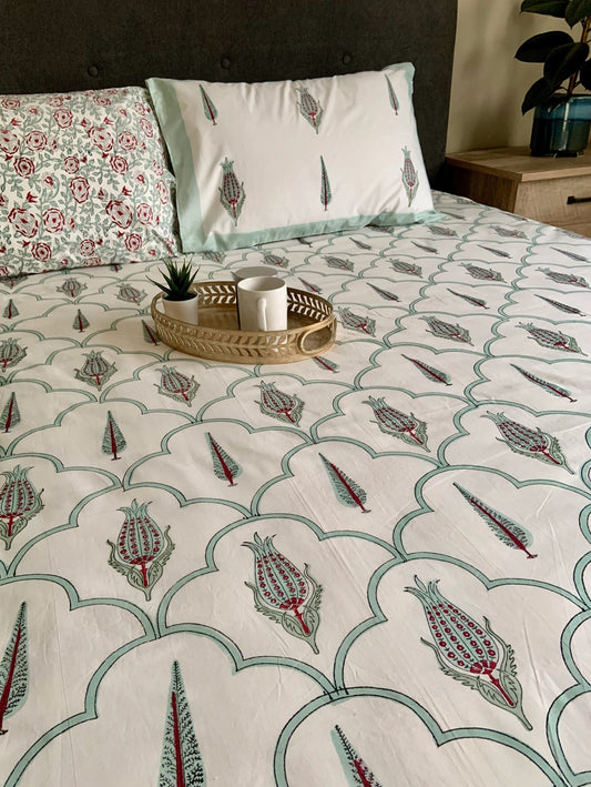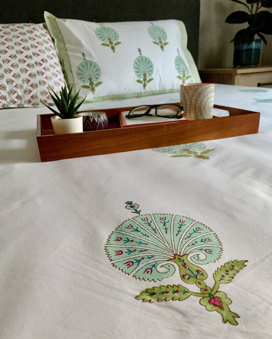 Fresh Foliage Block Printed Cotton Bed Sheet- QUEEN